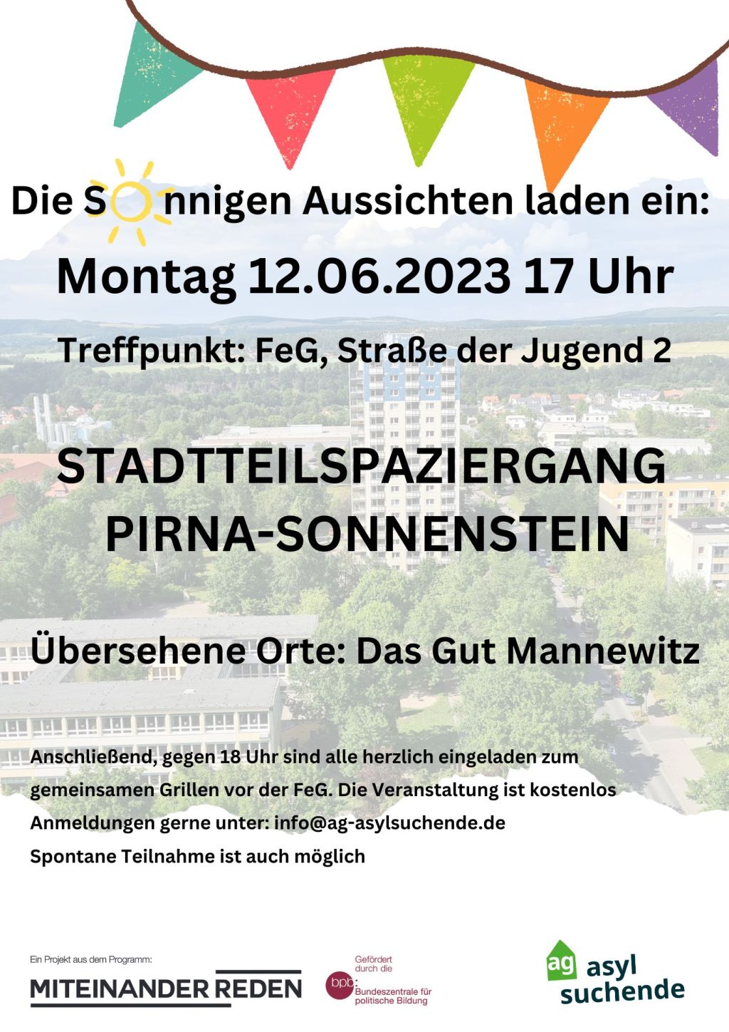 Nachdem wir den Termin im März kurzfristig verschieben mussten, laden wir nun nochmal ein zum Stadtteilspaziergang Pirna-Sonnenstein am Montag, 12.06.2023 um 17 Uhr