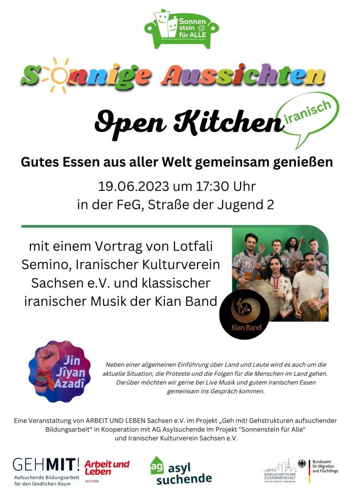 Gemeinsame Veranstaltung der Sonnigen Aussichten, dem SofA-Projekt der AG Asylsuchenden SOE e.V. und Arbeit und Leben Sachsen e.V. im Projekt Geh mit! Bildungsarbeit für den ländlichen Raum mit dem Iranischen Kulturverein Sachsen e.V. und der Kian-Band.
